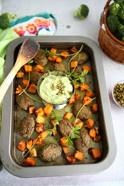 http://schneiderchen.de | © 2018 | http://angiesrecipes.blogspot.com There is nothing better than homemade falafel and these baked broccoli falafels with mung beans are super easy, healthy, and flavourful. Enjoy them for a meat free lunch or dinner with avocado sauce or garlicky-yoghurt dressing.